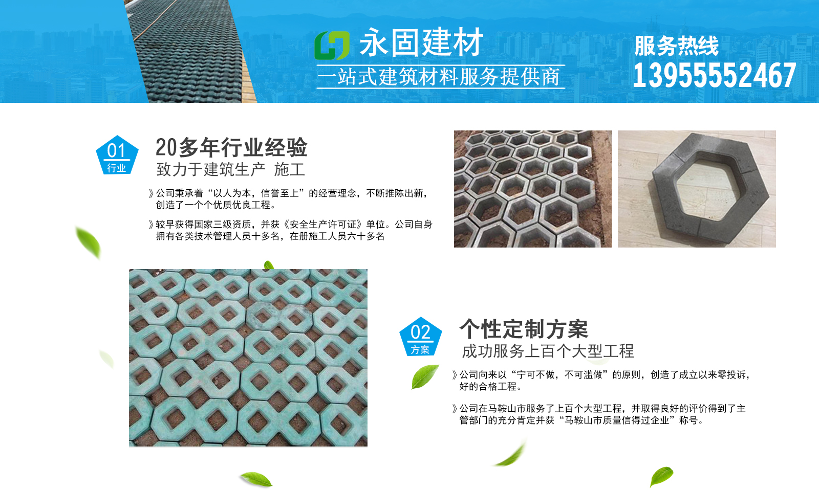 馬鞍山市永固建材有限公司,成立于一九九六年六月。公司秉承著“以人為本,信譽至上”的經(jīng)營理念,不斷推陳出新,創(chuàng)造了一個個優(yōu)良工程。較早獲得國家三級資質(zhì),并獲《安全生產(chǎn)許可證》單位。公司自身擁有各類技術(shù)管理人員十多名,在冊施工人員六十多名,公司向來以“寧可不做,不可濫做”的原則,創(chuàng)造了成立以來零投訴,好的合格工程。得到了主管部門的充分肯定并獲“馬鞍山市質(zhì)量信得過企業(yè)”稱號。我們從戰(zhàn)略高度審視市場,創(chuàng)造性開展各項工作,在建筑裝飾行業(yè)中,力爭做到人無我有,人有我精,在保證硬件實施的同時,注重軟件環(huán)境的建設(shè),按現(xiàn)代企業(yè)制度的要求,樹立誠信的企業(yè)理念,推進企業(yè)的管理向系統(tǒng)化、正規(guī)化、制度化邁進;為創(chuàng)造好的企業(yè)、優(yōu)異的效益、好的管理打下堅實的基礎(chǔ)。我們把企業(yè)的發(fā)展、回報客戶和社會當(dāng)做首要務(wù),我們追求優(yōu)良品質(zhì),將以至誠至美的團隊協(xié)作精神誠信服務(wù),竭誠為廣大客戶提供完善的服務(wù)。